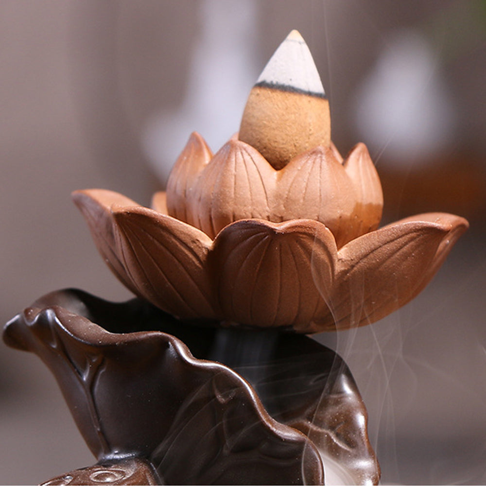 This lotus design censer is not only far-reaching in creativity, but also exquisite in craftsmanship. Using traditional manual skills, the shape of the utensil is natural and smooth, and the lines are more beautiful and coordinated. Light the backflow incense, and the white smoke slowly flows into the lotus pond, creating a natural and calm vibe.