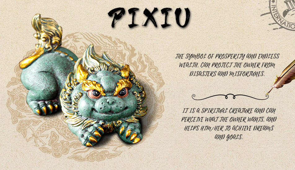 Pixiu is a mythical creature in Chinese mythology and is the symbol of prosperity as well as endless wealth. It can perceive what the owner wants and thus helps him/her to achieve dreams and goals.