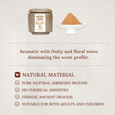 Feel the herbal and deep aroma of our Ambergris Incense Powder. Made with natural plants and trees such as agarwood, and ambergris finely ground into powder and blended with nanmu wood powder. No artificial chemicals, colors, or harmful substances. The incense powder can be used to create incense seals, cone incense, or for electric burner heating. It can also be manually crafted into stick incense.