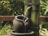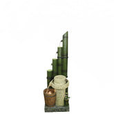 This bamboo-style flowing water fountain is crafted from high-quality resin and designed to recreate the natural texture of real bamboo and vintage ceramic jars. The bamboo sections feature a soft, natural green tone, accented with resin faux-hemp rope for added detail. The ceramic jars are finished with a weathered, rustic surface that contrasts beautifully with the smooth bamboo texture, creating a clean, elegant look with a touch of Eastern zen charm.