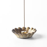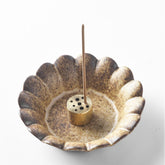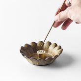 This Japanese ceramic incense holder cleverly combines natural aesthetics with practical functions, suitable for home, Zen room, leisure corner and other scenes. The overall shape of the incense holder resembles a blooming flower, matched with a golden incense holder, showing elegant charm.