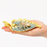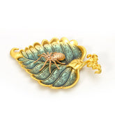 Design: Based on the Bodhi leaf, the leaf presents a beautiful arc and natural vein texture. The main color of the leaf is turquoise, and the surface is decorated with exquisite patterns. The edge and petiole of the leaf are outlined in gold, with bright colors, forming a sharp contrast with the turquoise leaves, highlighting the sense of hierarchy. A lifelike spider is placed on the leaf. The spider is realistic, and the details of the legs and the texture of the body are clearly visible, adding a touch of liveliness and fun to the entire incense holder.