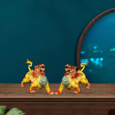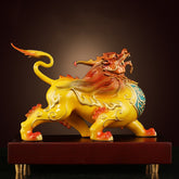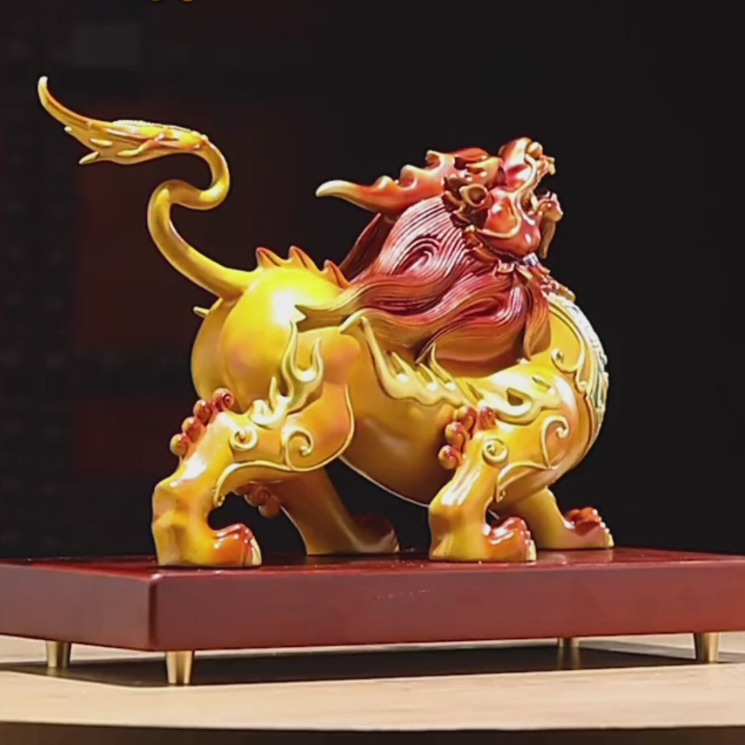 This stunning pair of Pixiu figurines is crafted entirely from solid brass, featuring rich hues of gold, red, and blue that create a vibrant, elegant finish. Each Pixiu showcases a dragon-inspired head with finely carved mane details and a powerful open-mouth expression that radiates strength. Intricate traditional patterns adorn the chest, blending gold and blue tones for a luxurious, classic look. With their strong stance, coiled tails, and polished wooden base, these brass Pixiu statues combine traditional symbolism with refined craftsmanship, bringing both beauty and authority to any space.