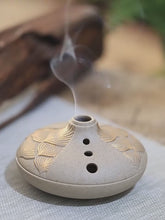 This is a Japanese-style incense burner with a coarse pottery and golden lotus. It has a porous and flat design to ensure sufficient oxygen supply, good smoke output, and is exquisite and unique. The clay is fine, and the cover is designed with lotus petals, which means auspiciousness. The overall simplicity is generous. Place it on the tea table and burn incense and drink tea with three or five friends, which is a unique charm.