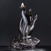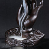 These two waterfall incense burners feature a Buddhist hand design and come in two wood options: black ebony and huanghuali rosewood.