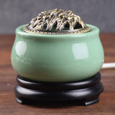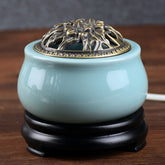 This temperature-controlled electric incense burner comes in light blue, light green, and black. The ceramic body has a smooth glaze and a vintage metal carved lid, giving it a calm, elegant Chinese look. It features a knob controller with precise 50°C-320°C heating and a 1-5 hour timer. It works with wood powder, wood chips, essential oils, and more, allowing you to adjust the heat to release layered scents.