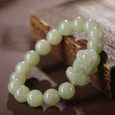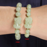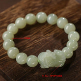 This Hetian jade Pixiu bracelet is meticulously hand-carved from premium jade. The beads feature a soft greenish-white hue with a smooth, oily texture and a gentle natural sheen. Each bead is perfectly round and evenly polished, offering a pleasant, silky touch.