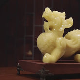 This elegant pair of Pixiu figurines is finely carved from smooth, lustrous jade stone. The warm translucent hue, available in shades of golden-yellow or icy blue, creates a soft, natural glow that enhances the piece’s refined character. Each Pixiu features a dynamic stance, with its head raised and mouth open in a powerful yet graceful expression. Every detail is carefully sculpted from the curling mane and flowing limbs to the intricate cloud patterns revealing both vitality and artistry.