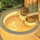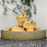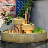 This Japanese-style bamboo fountain is crafted from premium resin and designed to mimic the warm, natural texture of real bamboo. The entire piece features a soft light-brown tone and blends classic elements of a Japanese garden, layered ceramic-style platforms, a decorative waterwheel, and a bamboo water spout. Fresh green plant accents are added along the edges, bringing the scene to life and enhancing its calm, zen-inspired atmosphere.