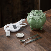 This incense burner is made of light celadon and shaped like lotus petals, with soft, rounded lines. It comes with a matching hollowed lid and a three-leg design for added traditional charm. The tone is fresh and gentle. It includes a knob controller with 60°C-520°C precise heating and a 0.5-4 hour timer, supporting a wide range of incense materials and adjustable heat for layered scents.