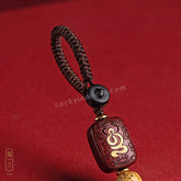 2. Lucky coin is round in shape and is a traditional accessory in China, symbolizing safety, good luck, smooth progress, as well as endless wealth. The lucky coin is carved with two dragons, symbolizing power, honor and success. Besides, there is also a rotatable purple gold cinnabar bead inlay carved with "Om Mani Padme Hum" (six famous words in Buddhism) which symbolizes the great wisdom of Buddhism.