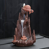 When a backflow cone is lit, smoke falls from the peak like water cutting through a canyon. The sun, mountains, and drifting mist create a poetic blend of Chinese landscape art and the calming ambiance of backflow incense.