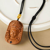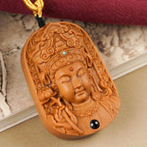 ● Information: 1. This pendant is made from sandalwood, which has a pleasant aroma and symbolizes wealth attracting. 2. Guanyin Bodhisattva is one of the most revered bodhisattvas in Buddhism who can not only save people from sufferings, but also endow them with safety and health. 3. The pendant is engraved with three-dimensional patterns on both sides. The front is carved with Guanyin Bodhisattva holding a lotus flower, while the back is carved with patterns such as auspicious clouds and lotus flowers, which have profound cultural meanings and are highly exquisite as well.