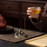 This dual-purpose incense burner features a clear glass cover paired with a mountain-shaped base in a rich teal glaze. A gold-accented mountain peak sits on top as the incense holder. When the glass cover is in place, the smoke gathers inside and drifts like mist around the mountains. Remove the cover, and the base can be used on its own to hold stick incense, giving you options for different moods and settings. The high-temperature teal glazing makes the mountain scene look vivid and dimensional, while the gold details add a refined touch. It's a beautiful piece for a tea table, bringing a calm and elegant Zen feel to your space.